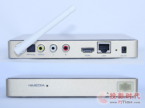 而对于机器的正/背面,H7三代机跟二代机则是完全一样,正面一个HIMEDIA字样及复位键跟红外接收窗,背面则是机器的接口配置。