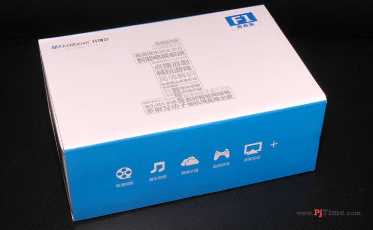 外包装方面,开博尔F1青春版采用了开博尔智能盒子的一贯包装风格,以白蓝色系为主色调,由盒子的各种功能概述组成一个大大的数字“1”字,同时在包装侧面将盒子的主要功能以图表形式标注出来,相对于开博尔以往盒子的包装来说,F1青春版的包装要小很多。
