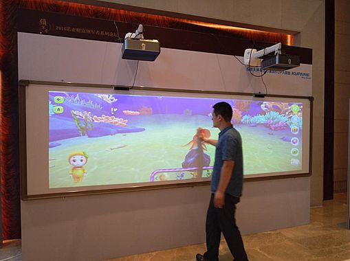 当然,最吸引人的还不是投影大屏融合解决方案,而是KUPA自主研发的拥有交互式新体验的投电脑一体机KUPA P1,给在场观众留下了深刻的印象。KUPA超投电脑一体机是行业内唯一一款将电脑、交互式电子白板和超短焦投影集成到一起的机器。其超短焦技术带来的超大屏的视觉呈效果,吸引了众多观众的目光;而KUPA P1灵敏流畅的手触、笔触交互式体验,则让现场观众赞不绝口。KUPA P1采用业内领先的交互技术,只需一面白墙,就可在投出的墙面上进行书写、绘画、标记、批注等功能,触控灵敏、手写流畅;另一方面,P1支持开机自动校准,更好地保证了其手写、触控的灵敏性;除此之外,一键同屏、体感游戏等交互功能,使得P1的交互式体验更上一层楼。