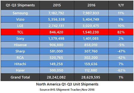 2004年,TCL收购汤姆逊后,在北美成立了分公司。2010年TCL北美分公司总部迁至加利福尼亚州的科罗娜市,开始经营TCL品牌,将中国的电视品牌带到了美国市场。2011年-2013年,TCL处于起步阶段,年销量十多万台。2014年年销量稳步地上了一个台阶,销量达到36万。2015年迎来新突破,销量达到101万。2016年,TCL电视成为北美市场增长最快的品牌,年度销量预计可达200万。在主流的4K高清电视产品市场中,TCL抢占了大片市场。在北美最大的网络电子商务公司之一的亚马逊上,TCL已经成为继三星之后销量第二的电视品牌,一直稳坐畅销排行榜前列,索尼、松下等国际巨头都只能屈居其后。截至到11月底,在IHS上,TCL已经超越索尼和夏普,跃居北美彩电销量第四。
