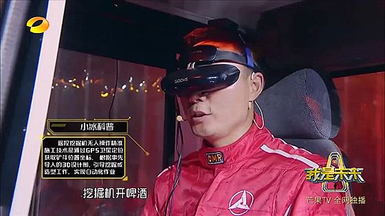 在节目现场,当三一重工的操作员戴着GOOVIS智能眼镜,在演播室内远程操控2公里外的无人驾驶挖掘机“大挖”,连续精准撬开三个啤酒瓶盖时,全场观众为之震撼!而且据易小刚解释,这是未来世界的挖掘机技术——借助VR技术遥控挖掘机无人操作精准施工技术,这种远程操控是不受空间距离限制的,这个无人挖掘机可以放到地球的另一边!