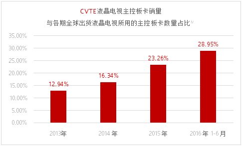 创建于2005年,以TV板卡业务起家的视源股份,如今是全球优秀的液晶显示主控板卡供应商。截至2016年6月30日,其液晶显示主控板卡全球销量累计超2.6亿片,并达到了28.95%的全球销量占比,实现了连续四年的稳定增长。