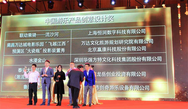 3月18日晚上,中国游乐行业第三届摩天奖盛典在北京举办,在此次评比活动中,南昌万达城电影乐园“飞越江西”预演区“大瓷瓶”投影装置秀,获得了“中国游乐产品创意设计奖”。