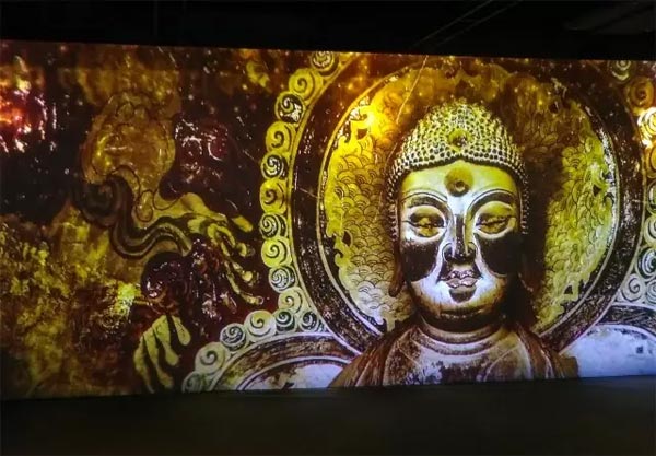 莫高窟始建于十六国的前秦时期,历经十六国、北朝、隋、唐、五代、西夏、元、清等历代的兴建,其大量的壁画、彩塑精美而生动被誉为“世界最大的艺术宝库之一”、“东方卢浮宫”。然而由于人为破坏、自然风化、保存不当等原因,导致现存于世的作品早已不复当年的光鲜亮丽,很多壁画早已剥落,无法窥其原貌。在这次艺术展中运用数字手段再次临摹作品,在原有石窟剥落的基础上进行修复,新旧画面的完美合成让参观者仿若穿梭千年,看到古老匠人们刚刚完成作品时的风貌。