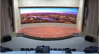 与方方正正,中规中矩的传统报告厅大屏幕不同,赢康和核心合作伙伴创新地根据“球形”报告厅打造了弧形学术报告厅大屏。该项目坐落在中山大学中山眼科中心,使用了三台科视Roadster S+22K-J投影机,采用正投融合的投影方式投影于18块dnp Infinity 拼接而成的50度光学屏幕。巨大的弧形屏幕,绚丽的画面,让人眼前一亮。