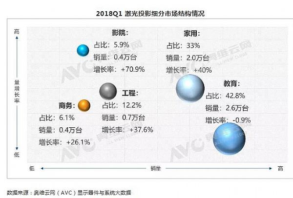 业内人士认为,这一市场格局的形成主要与“教育市场”前景不明,可能结束高增长期,进入稳定阶段有关系。同时,以“稳字”当头的还有工程和影院行业,这一市场激光渗透比已经达到7成,未来的增长将趋于“平缓”。即,教育和工程在2018年激光显示行业的成长引擎效应要“下降”。