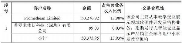 招股书显示,Promethean在2017年合作首年便成为公司第一大客户,贡献了5.03亿元的营业收入,占比13.93%;2018年1-6月Promethean的营收贡献已经超过2017年全年,达到了5.21亿元,营收占比上升至28.71%。Promethean Limited、普罗米休斯科技(深圳)有限公司均属Promethean World Limited全资子公司。
