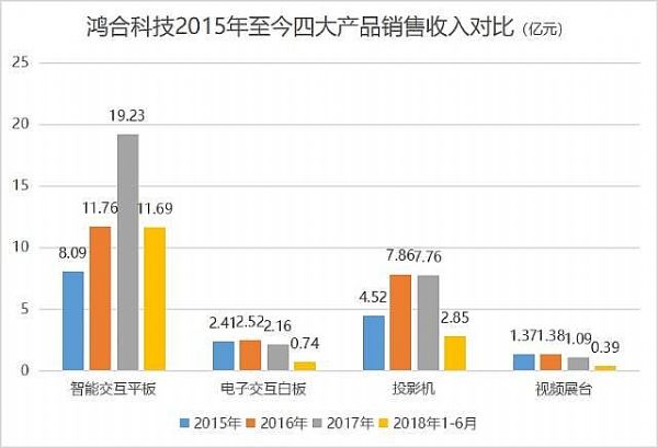 鸿合科技拥有四项主打产品,分别是智能交互平板、电子交互板、投影机和视频展台。自从与Promethean达成合作后,智能交互平板就成为公司销量增长最快的产品,且成为唯一增长产品。与此同时,由下图可见,2017年和2018年上半年公司另外三项产品的销售增长停滞,甚至下滑。