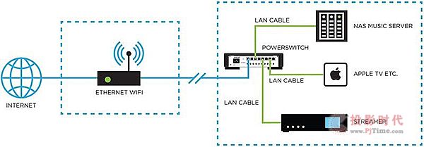 PowerSwitch要如何使用呢?装在无线基地台(或路由器)与串流播放设备之间即可。你可以用一条网络线连接无线基地台与PowerSwitch,然后将其他的串流播放设备,例如串流播放器、NAS、Apple TV、多媒体播放器...等,都接上PowerSwitch,就行了。小蔡店长还说,网络线的好坏也会影响播放质量,如果不是每条网络线都很好,请将最好的那条网络线接在PowerSwitch与串流播放器之间,可得到相对最好的效果。