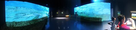 法国南部阿尔勒地区是梵高生活的地方,这里的自然风光成为他的创作源泉,特别是麦田澎湃的景象,在他很多作品中出现。4台BenQ工程投影机SU765分别在两侧拼融投影大画面,将《丰收在普罗旺斯》等作品中强烈的色彩、明亮的色调完美呈现;而且在画面前方还特别摆放了麦穗,观众仿佛面对大片麦田,获得更真实体验。