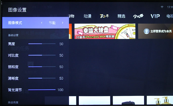 用户可根据不同的观影习性或者不同的片源对画面的亮度、对比度、饱和度、清晰度以及背光进行调节。同时,根据使用习惯用户还可以对整机的图像模式进行选择,内置了标准、节能、用户自定义等多种常见场景的模式供用户使用。
