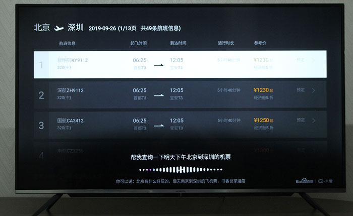 在体验中,我们可以直接通过语音声控对创维55A5智慧屏下达指令,查询机票信息、酒店信息或者其他一切能通过互联网查询的信息。