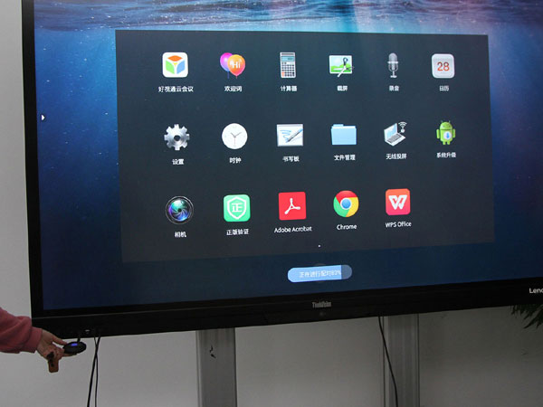 另一方面,在系统主“界面”上,联想BM系列旗舰版会议平板提供展示企业形象的“统一桌面大图”设置,并采用“突出会议核心应用”的菜单主界面——显著区别于一般智能手机或者智能电视的“海量菜单模式”,而是将“白板”“会议”“文件”三大选项前置,并用更多选项满足差异化应用。使用中,这种设计,基本保障开机后三步走进入“会议内容”。