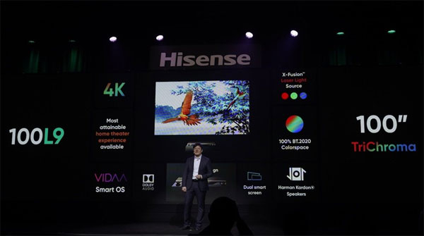 除了可卷曲屏幕的电视以外,本次海信还推出了75英寸和100英寸全色激光电视,定义电视的色彩未来。新品可完美还原、真实再现自然界中全部色彩,达到人眼可识别色彩的90%。而激光电视也是唯一能够达到未来电视色彩顶级标准——BT.2020的显示产品。其中,海信100吋全色激光电视还将带来全球首次4K激光电视杜比视界(Dolby Vision)内容回放的技术展示。