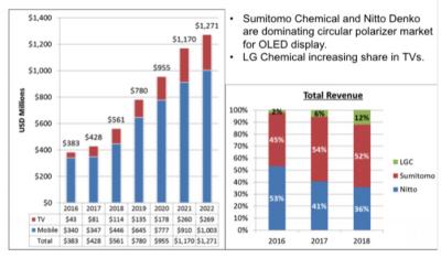 2018年,DSCC曾预计,OLED圆形偏光片市场将从2017年的4.28亿美元增长到2022年的12.7亿美元。该市场仍然由移动显示屏主导。2018年,OLED圆形偏光片市场由住友化学和Nitto Denko领导,LG化学扩大了其在OLED电视偏光片市场的份额。