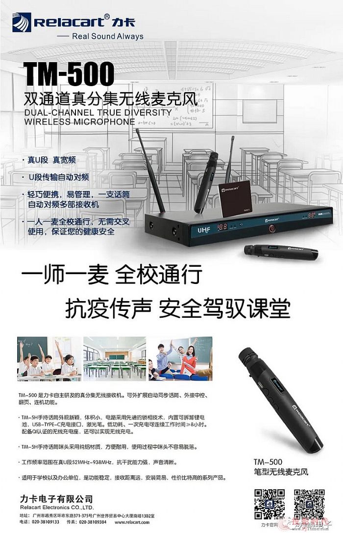 力卡电子作为国内专业研发生产27年的无线有线音频厂家,所开发出的TM-500双通道真分集无线麦克风,不但功能稳定、安装简易、性价比高,且拥有“真正实现频率管理•无线分区,一支麦克风走遍多个课室”的技术亮点,成为了校方打造专业教育系统的不二选择。