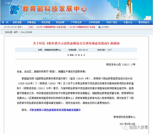 9月10日,教育部科技发展中心发布关于印发《职业教育示范性虚拟仿真实训基地建设指南》的通知,通知公布了《职业教育示范性虚拟仿真实训基地建设指南》。