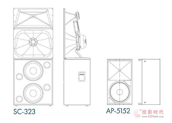 例如,用于通常扩声系统的AP-5152的?高频号角为 75°,其?锥形覆盖角与单个15 英寸低音扬声器的频谱范围非常匹配,交叉频率约为 1 kHz。为了在 1 kHz 以下保持统一的覆盖模式,号角尺寸必须更大。为了适应这一点,影院扬声器的中音号角宽度大约是 AP-5152 号角的两倍,这使得分频点控制可以扩展低一个倍频程,或降低到 500-600 Hz。