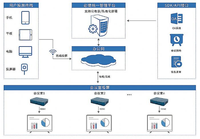 智能办公无线协作场景,支持手机、PC与会议室LED、TV、投影仪屏幕交互,无线显示,提供开放式接口,可与第三方办公系统深度整合、对接;并支持会议盒子的统一配置管理、信息发布、远程维护、投屏数据统计分析等应用。