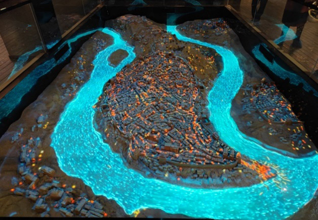 科视 LWU900-DS 激光投影机为“山城嬗变”展区的沙盘(上)和“商贸往来”展区的墙面(下)赋予了生机(图源:中影瑞航)