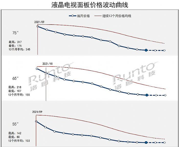 这样的行情下,导致了“市场价格趋向稳定”。例如,洛图科技调研预测,32-55英寸面板四季度价格基本稳定,将结束18个月的连续下跌。65/75英寸面板的下跌幅度也会集中到一两美元,几乎接近止跌。液晶面板市场价格下跌筑底,达到谷底的趋势非常明显。