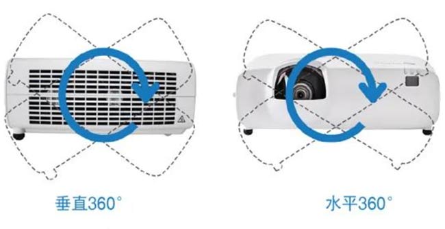 独立的光源模块与特殊的风道系统,可让投影机垂直360度与水平360度的自由投影。通过不同的角度安装投影机,以应对各种环境,应用于不同的场景。