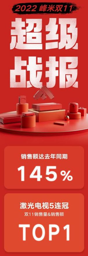 2022年双11促销活动落下帷幕,各大平台、厂商在这次年末大促中获得更多用户的关注,并且收获不错的成绩。其中,峰米投影的战绩颇为亮眼,创多项佳绩。销售额较去年同期增长45%,强势再夺激光电视线上销售额和销量双料冠军,自2018年起,至今已达成五连冠!