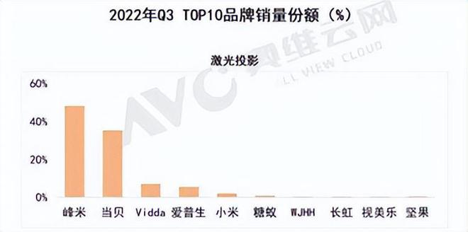 根据奥维云网(AVC)数据显示,今年三季度峰米、当贝以绝对的份额优势领先其他品牌,二者合计份额达83%。其中,峰米投影以接近50%的市场份额领军行业第一。