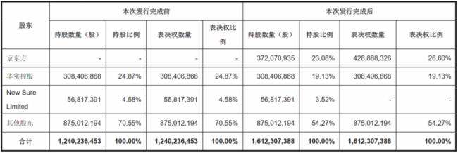 发行股票事项完成后,京东方将持有上市公司23.08% 的股份,控制26.60%的表决权;华实控股将持有上市公司19.13%的股份,控制19.13%的表决权,同时承诺不谋求华灿光电实际控制权;交易完成后,华灿光电控股股东将由华实控股变更为京东方 ,上市公司实际控制人将由珠海市国资委变更为北京电控,而本次发行完成后华灿光电成为京东方控股子公司。