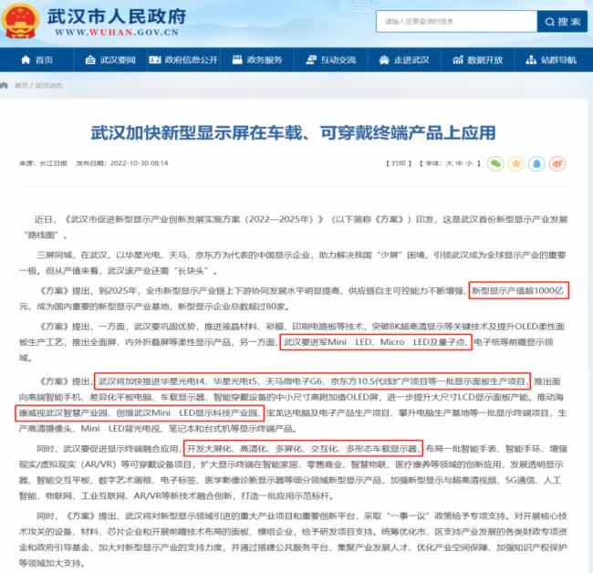 《方案》提出,一方面,武汉要巩固优势,推进液晶材料、彩膜、印刷电路板等技术,突破8K超高清显示等关键技术及提升OLED柔性面板生产工艺,推出全面屏、内外折叠屏等柔性显示产品,另一方面,武汉要进军Mini LED、Micro LED及量子点、电子纸等前瞻显示领域 ;