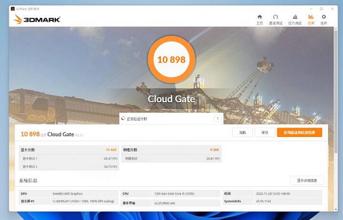 3DMark Cloud Gate测试项目中,搭载Intel 第12代酷睿i5-1235U CPU的NewCube N104获得10898的高分。