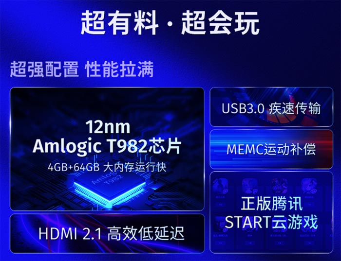 腾讯极光投影P2拥有1300ANSI流明亮度,搭载AmlogicT982芯片,拥有4GB+64GB运行存储空间。