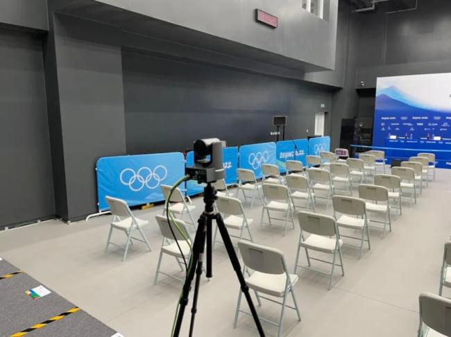 主新闻媒体中心通过点对点专用网络通信技术连接所有竞赛场馆,整体系统采用双机热备机制,系统运行时节点和服务器出现故障时,可实现无延时自动快速切换;分布式编解码盒子采用H.264/H.265、AAC/G711编解码技术。以双电源、双网络的备份的形式,将17个场馆的发布会现场拍摄的多角度视频(运动员、记者)和现场音频通过高清编码器稳定传送至主新闻媒体中心,主新闻媒体中心的信号经过远程同声传译中心翻译后的音频信号再通过高清解码节点发送至比赛场馆的新闻发布会的听会区域。同时,通过INFO编码器CH6A将17个场馆的发布会现场拍摄的多角度视频(运动员、记者)和多音轨音频(现场声 + 同传)推送到北京冬奥会新闻发布会视频服务系统(Info-AV),利用云计算的存储、计算、网络传输等资源音视频流进行合成、导播、制作及存储,并输出具有多音轨的音视频直播流,同时支持收录和点播。