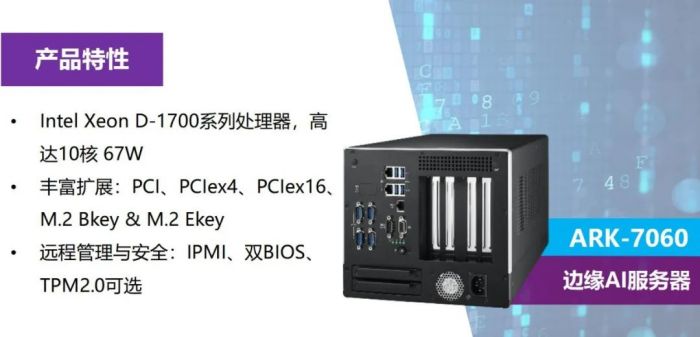 此外,ARK-7060最高支持4个2.5”SATA III硬盘,并通过10GbE端口和5G模块M.2 Bkey实现高数据传输率。ARK-7060板载BMC,为远程管理提供了IPMI架构,以实现远程故障排除,减少停机时间。