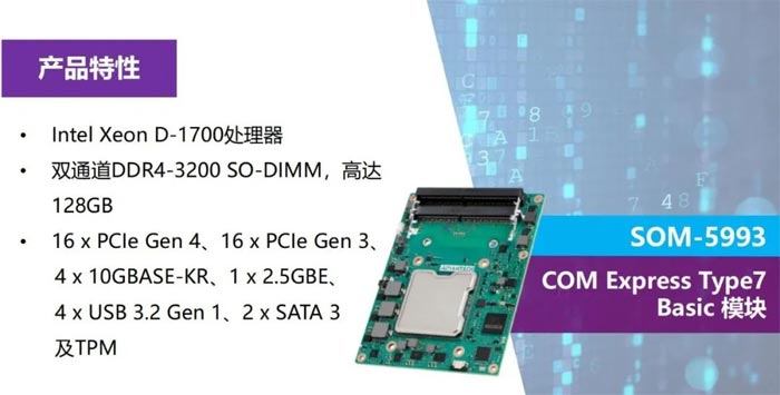研华SOM-5993,搭载最新Intel Xeon D-1700处理器,10核、67W TDP SoC,拥有超高速I/O接口(包括PCIe Gen4和10GBASE-KR),性能卓越。 同时,支持高达128GB内存(ECC可选),适用于需要高带宽、低延迟和快速数据传输的应用。
