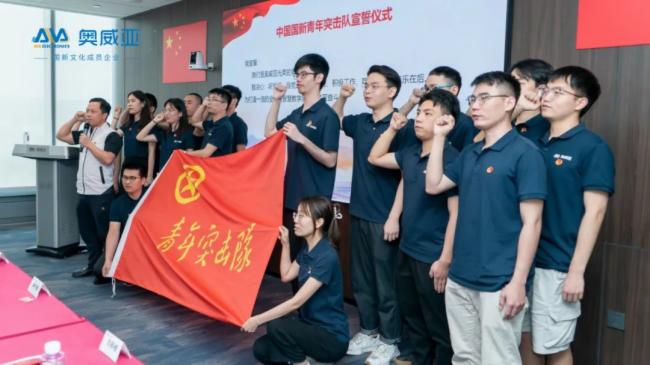 本次活动上,还有一项特别的仪式——中国国新青年突击队授旗与宣誓仪式。中国国新青年突击队是中国国新为充分发挥青年工作者的先锋力量,在各级公司团组织下组建成立的21支青年队伍。激励有为青年在“急难险重新”任务面前,挑大梁、扛硬活,充分发挥青年先锋和生力军作用。其中,奥威亚共有3支青年突击队,分别为人工智能产品开发突击队、全连接服务应用突击队、全连接平台开发突击队。本次仪式由奥威亚党总支纪检委员钟子春带领突击队员进行宣誓。