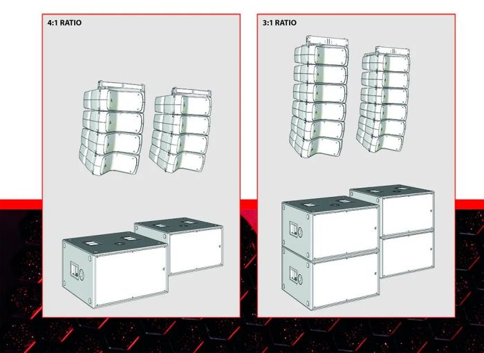 SW1800A 与 AX800A NEO搭配使用,用于基本/多用途的搭配推荐4:1组合方式,或采用3:1组合方式可应用于更高要求的演出应用。