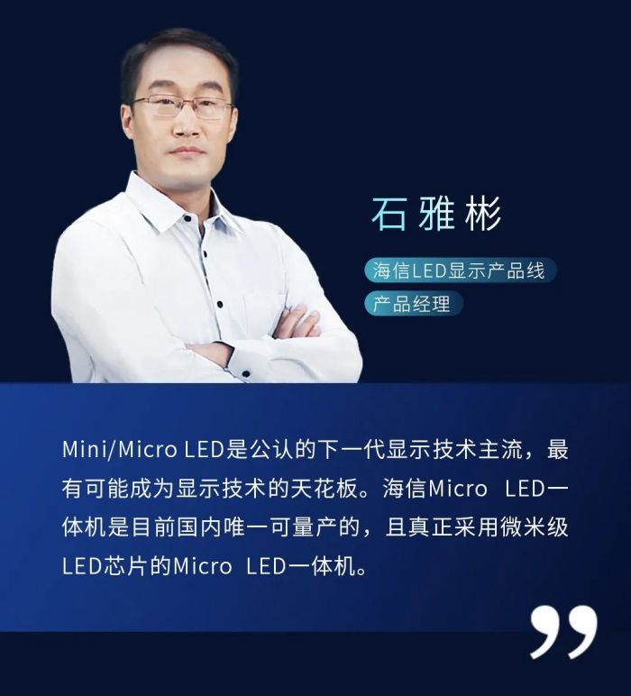 海信LED显示产品线产品经理石雅彬:“ Mini/Micro LED是公认的下一代显示技术主流,最有可能成为显示技术的天花板。海信Micro LED一体机是目前国内唯一可量产的,且真正采用微米级LED芯片的Micro LED一体机。”