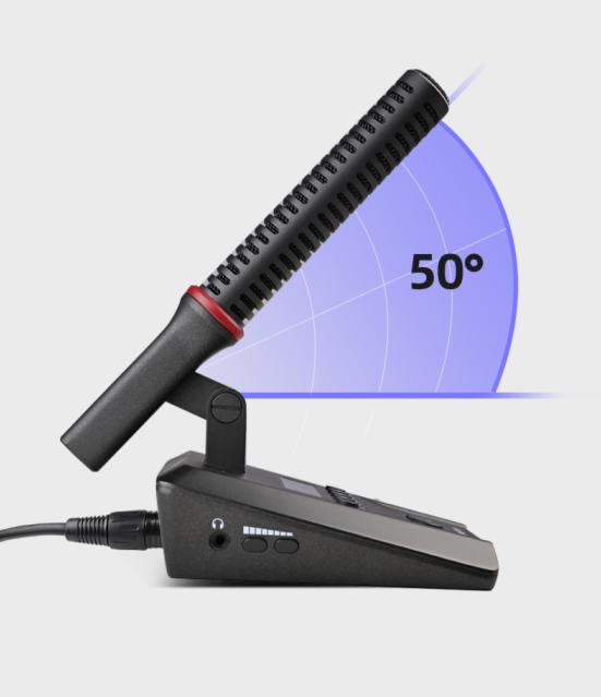 采用集音管+心型指向拾音,拾音灵敏方向准确,有效降低环境噪音的拾取,拾音距离达20-80cm,拾音距离远,演讲不吃力;麦克风与水平最大仰角为50°,与底座连接处增加锁紧设计,角度调整长时间准确有效。