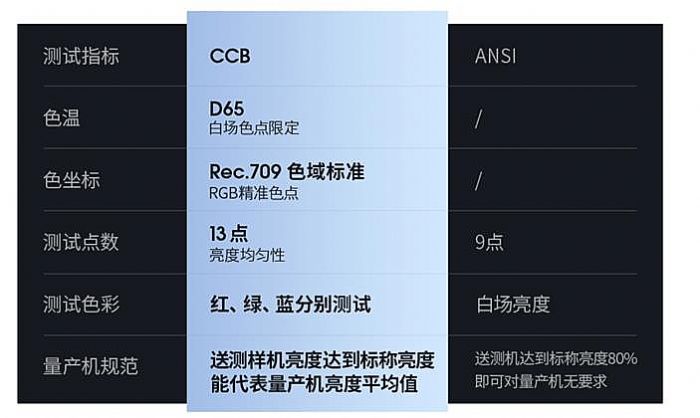 为什么要提出CCB这一亮度标准?首先,ANSI亮度标准不仅古老,还不严谨。例如,该标准允许实际量产机型与送检机型亮度相差20%;再例如,对亮度测量的规定非常简单,诸如色温、偏色等问题均不考虑。其次,ANSI亮度标准主要照顾的是传统的工业性投影。即这是一个曾经的工业投影市场制定的标准,这已经与国内家用投影、视听需求为主的市场格局截然不同……