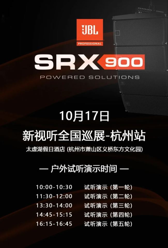 新视听全国巡展第十季杭州站于10月17日(明天)在太虚湖假日酒店盛大开幕,通过一课、一讲、一会、一展、一秀的形式,与行业同仁齐聚一堂,深入交流,共谋发展!另外,杭州站户外线阵试听中,巨声试听携SRX900系列巡演级有源线阵列扬声器 上阵,给观众呈现一场精彩纷呈的听觉盛宴。