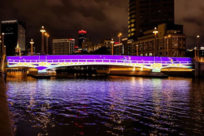 河南路桥与上海总商会门楼联动,携手上海本土漫画 Tango,打造主题光影秀《摩登苏河 SHANGHAI CHIC》。
