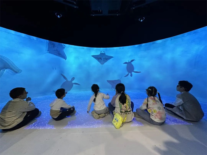 此次展会两激光投影解决方案,通过十四台全色激光工程投影机融合实现,动态展示了视频场景的视觉效果。全色激光工程投影机可搭配多种镜头,安装灵活,垂直、水平方向360°全方位投影,可满足不同场合安装条件下的差异化需求,呈现出全新的视觉盛宴。 科普应用、创意表达,全色光显联合金诺科技通过多种表现手法,以科普教育为线索,激光投影为播放载体、构成元素,形成独具一格的沉浸式激光投影展厅,塑造了科普教育、创新创意的新玩法。