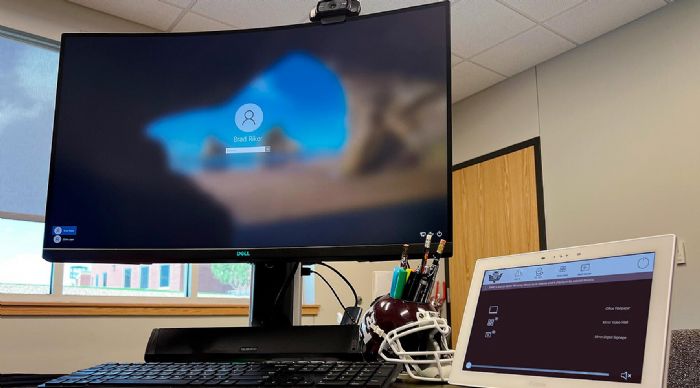 校长的办公桌上配备了一台 PC 工作站,用于视音频内容制作,并通过 TouchLink® Pro 触摸屏选择视音频内容的路由。室内还配备有平板显示器和 Camera-Speaker Bar。校长可通过它们参加视频会议,并可从这里向校内所有集成 AV 系统的教室进行广播。行政办公室内运行了 Extron 控制应用程序的 iPad,通过无线 Wi-Fi 可实现 AV 系统控制界面的镜像, 使得 AV 系统控制可被延伸至这两个办公室,乃至校内其他地方。