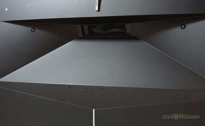 由于X1A激光电视主机采用的是长方形的造型设计,所以机器的状态指示灯设计在中间部位,从正面看指示灯就像机器的分割线一样,将机器均匀的从中隔开。同时,机器在通电待机室指示灯会发出微弱的蓝色光芒、使用时会发出淡绿色光芒,为观影环境起到一定的点缀效果,非常温馨。