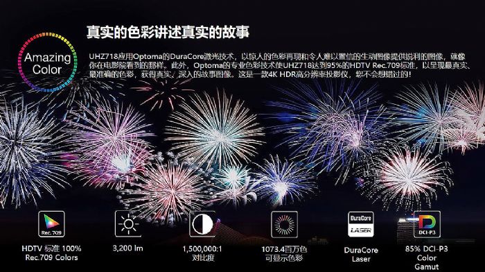 得益于TI DLP技术与Optoma DuraCore激光技术的双重加持,奥图码UHZ718 4K智能激光投影机的激光光源能够实现3200 ISO21118流明亮度以及1,500,000:1对比度,色彩方面支持10 bit色深,能够生动呈现1600万种色彩。