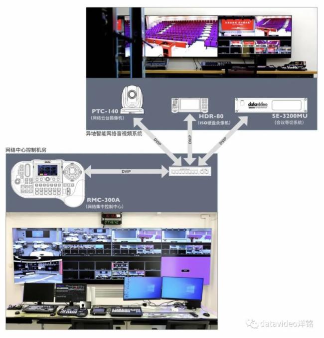 这分别分布在两栋教学楼不同楼层的三间教室(前文提到的合班教室、多功能报告厅,录播教室)单独使用的时候,教师还可以忙的过来,可是一旦同时使用就要在楼宇直接来回奔波。以前传统的日志式设备管理模式已经不足以应对现代庞大的网络化视听系统了,所以在设计解决方案系统时,采用的网络分布式架构的大型音视频系统设计,建设综合控制中心,加入IP网络的控制方式,在集中控制每间教室的设备的同时不影响教室的独立操作运行。这样的系统方案设计对设备的要求较高,也就有了设备综合控制中心的概念。在系统设计中,我们将各个教室的主输出视频信号使用光纤的传输方式接入综合控制中心的SE-3200中进行切换,也将各个教室的IP网络相互串联,使用RMC-300A来控制云台摄像。