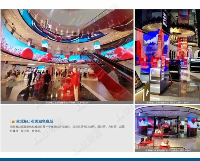 雷曼康硕展共计为深圳免税海口观澜湖免税城 打造了38块LED显示屏,包含圆柱屏、方柱屏、双面柱体屏、环形屏、橱窗屏等异形屏,将免税城打造成为拥有400+奢华品牌、20000+平方米的生活交际、旅游休闲“品质示范”中心,为消费者带来舒适的购物体验,引导国人崇尚品质生活的消费理念,引领充满时代精神的生活方式。
