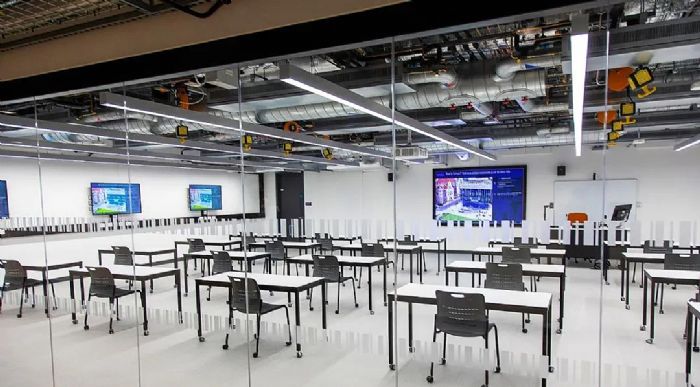 2 号融合场馆采用常规课堂与干实验室二合一的创新设计,成功将理论教学与操作应用完美结合。在理论教学区,7 个学生工作站都能与 2x2 的拼接墙联动,以增强可视性并优化协作 。场馆另一边为干实验室,这使得同学们能够在理论学习与实操应用之间自由切换,以加深对知识的掌握,并提升操作技能 。
