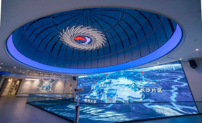 在展馆西厅的开放成果区域,高清LED大屏直观展示自贸区自成立以来取得的各项成果,对外贸易、招商引资、全球货运客运通道拓展等信息和数据在屏幕中一一清晰展现,让人切实感受湖南自贸区这片热土的朝气与活力。
